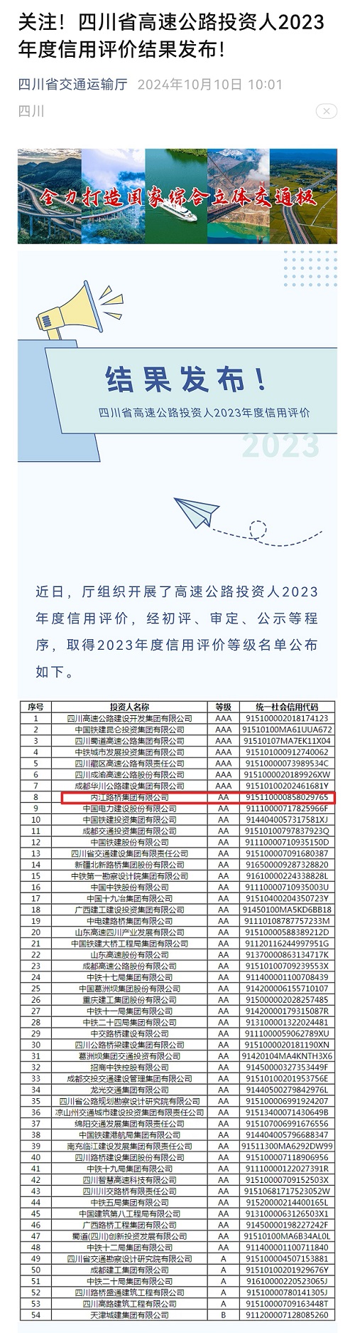 10月10日,四川省交通運(yùn)輸廳正式發(fā)布公告,內(nèi)江路橋集團(tuán)有限公司(以下簡(jiǎn)稱“內(nèi)江路橋集團(tuán)”)成為內(nèi)江市唯一獲評(píng)四川省高速公路投資人2023年度信用評(píng)價(jià)等級(jí)AA級(jí)企業(yè)。這是繼2020年首次獲評(píng)該等級(jí)后,連續(xù)第四年蟬聯(lián)AA等級(jí)。