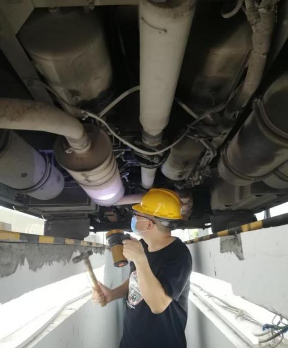 一把榔頭只為堅(jiān)守源頭安全。在車站車輛例檢處,例檢員劉海正在烈日下作業(yè),滾燙的水泥地面、發(fā)熱的客車底盤和客車尾氣讓車輛例檢臺(tái)溫度更高。劉海不停地在車輛底部鉆進(jìn)鉆出,從燈光、轉(zhuǎn)向、制動(dòng)、底盤,到車胎、螺絲、安全帶、消防錘等,認(rèn)真檢查著每一個(gè)車輛部件??蛙嚨撞康母邷刈屗氯ヒ淮伪闳頋裢敢淮?,臉上的汗也順著頭發(fā)往下滴落。說起自己的工作,劉海認(rèn)為雖然工作環(huán)境惡劣一些,但是與售票員、檢票員并沒有什么不一樣,只是分工不同,做好車輛例檢工作,保障客車運(yùn)行安全,是我們的責(zé)任,目的都是為旅客出行服務(wù)。
